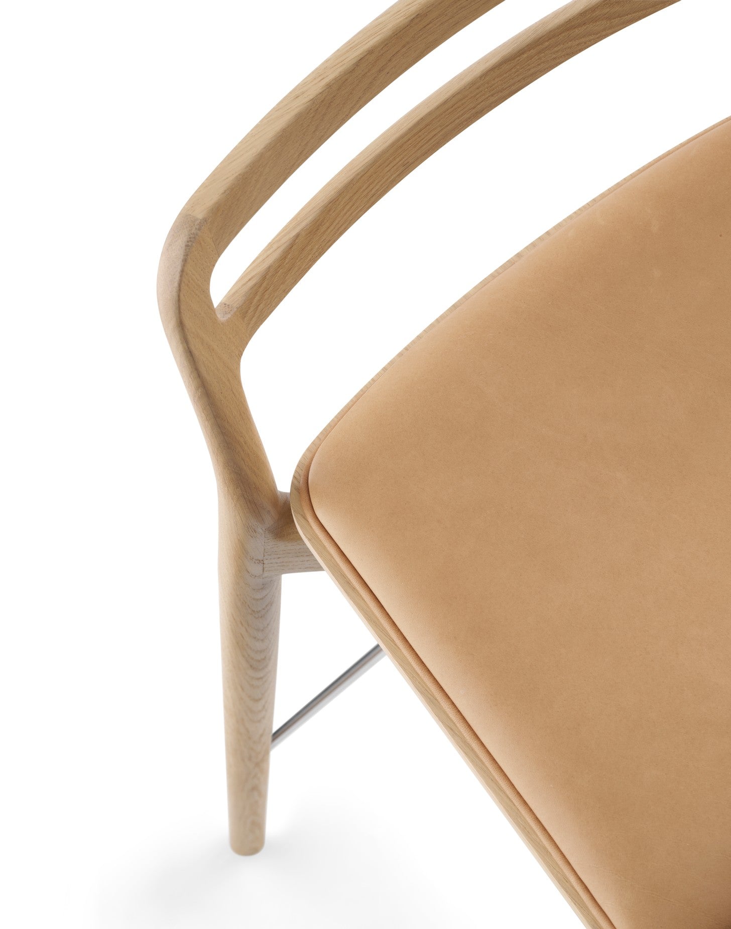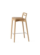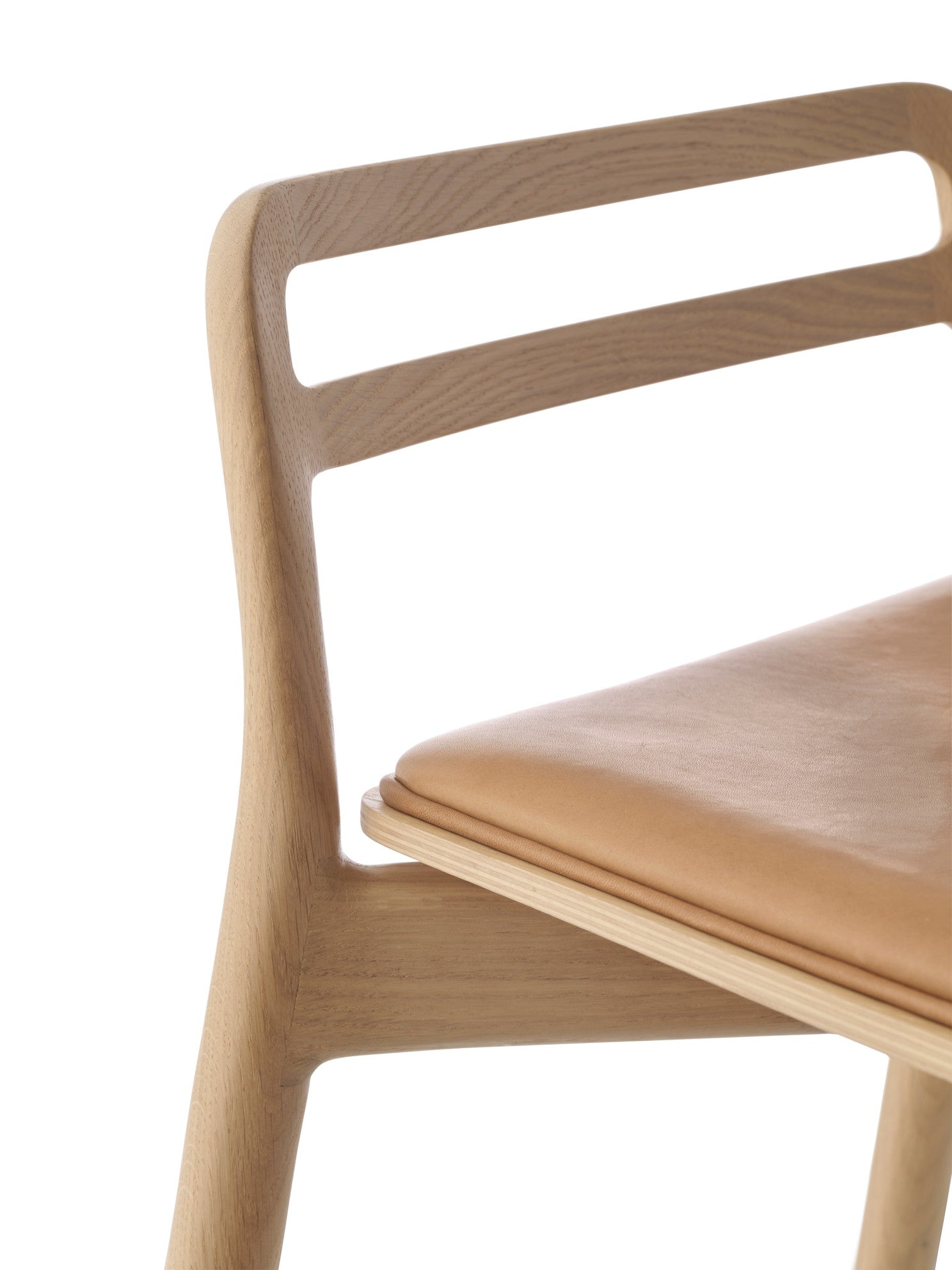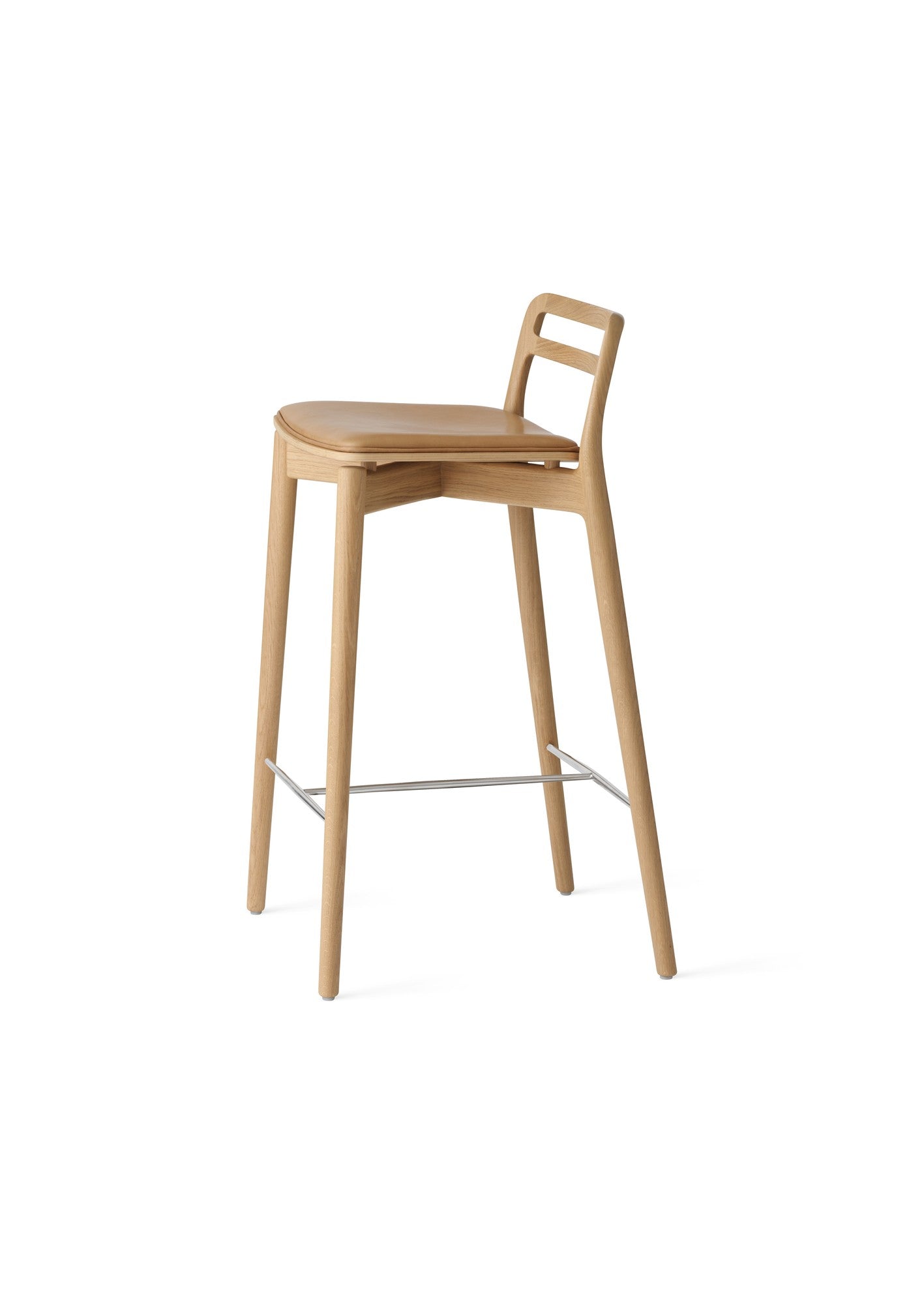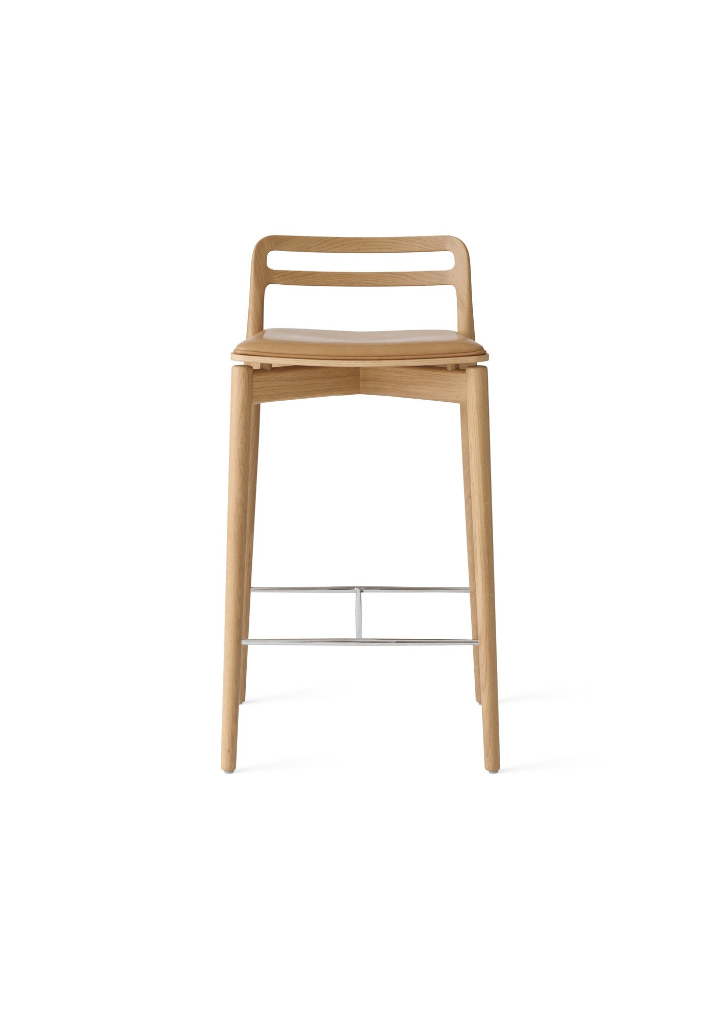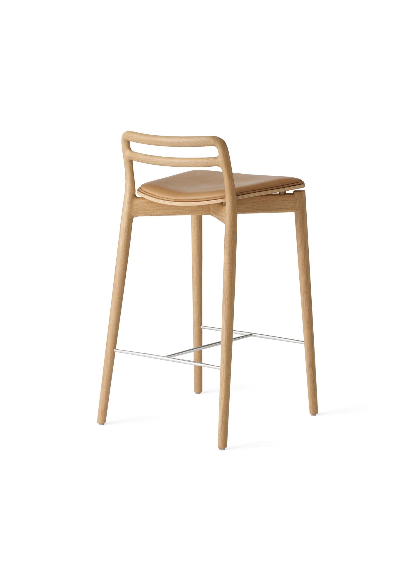 Vipp Cabin benkekrakk er laget for en kjøkkenbenk. Denne benkekrakken har avrundede komponenter i heltre eik og et svevende finersete med en påsatt pute i svart skinn. Den støttende fotstøtten i stål sikrer stabilitet.