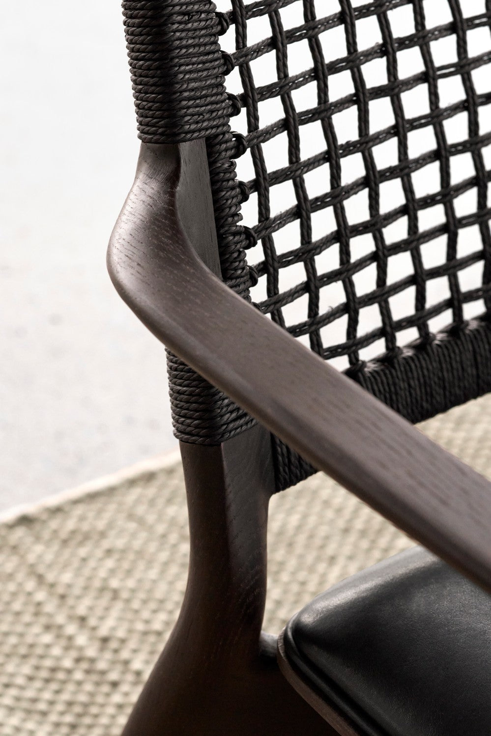 Vipp Cabin Lounge-stolen passer til stuen eller loungeområdet. Loungestolen har en solid eikeramme, som er myknet opp av en polstret pute i anilinskinn og en ryggstøtte laget av håndflettet papirsnor.