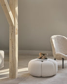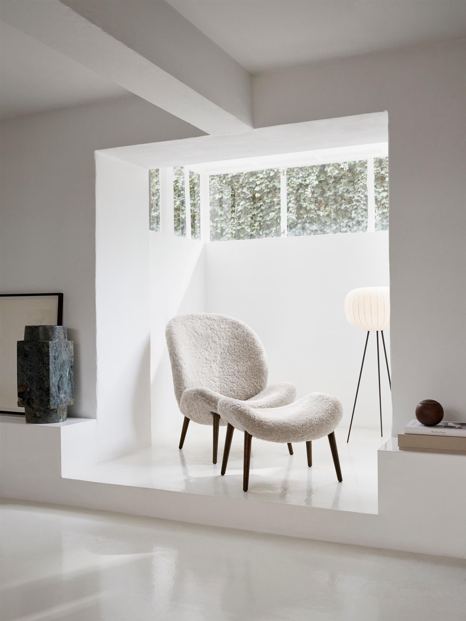 Vipp Lodge lenestol passer til stuen eller loungeområdet. Denne lenestolen har et støpt mykt skall og ben av heltre eik. Her vist i forhåndsdefinerte varianter med ben av mørk eik. (Pute og krakk medfølger ikke)
