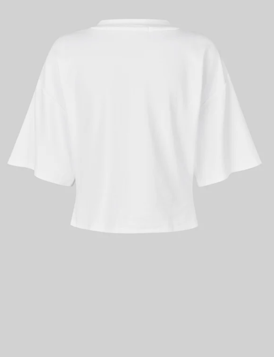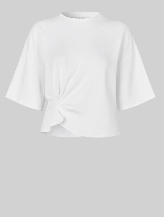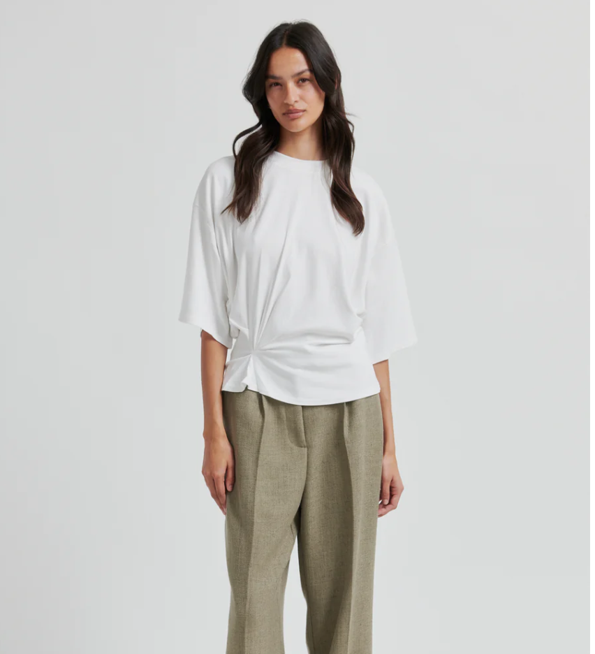 Second Female kortermet t-skjorte. T-skjorten er laget i en myk og elastisk tencel- og bomullsblanding. Har rund hals og senkede skuldre med korte ermer. Rynkede detaljer foran som skaper en drapert effekt. Avslappet passform øverst med mer tettsittende midje.