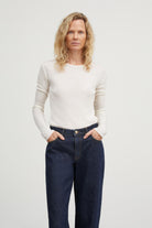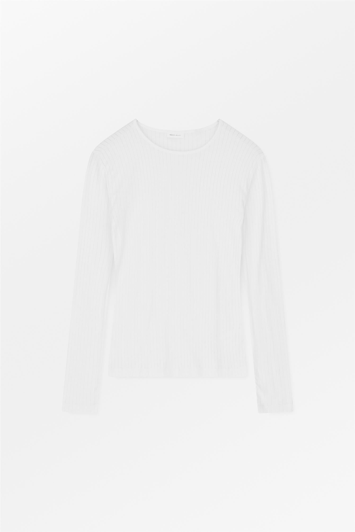 Myk ribbet bluse som sitter forsiktig inntil kroppen med rund hals og babylock-detaljer.