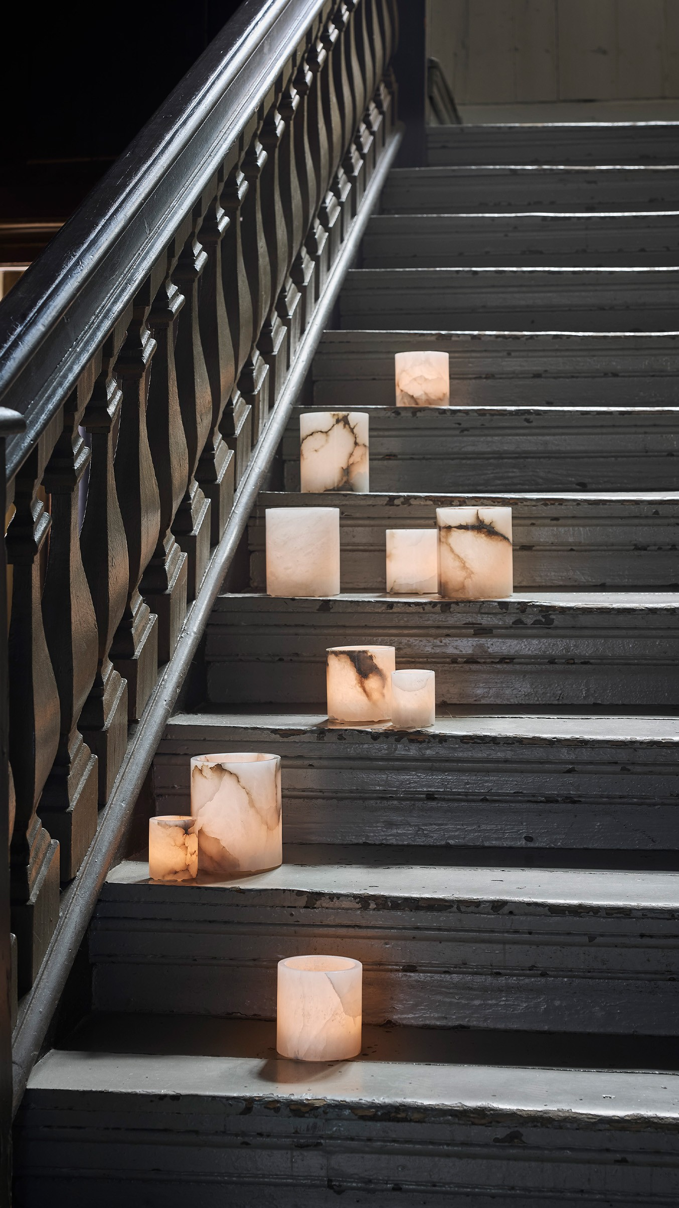 Lysestakene er laget av ekte alabast, et vakkert naturmateriale. Lyset skinner mykt gjennom steinen og fremhever dens naturlige struktur og glans. Hver lykt er unik fordi den er hugget ut av en større steinblokk – mønsteret og fargen kan derfor variere fra lykt til lykt. Se bildene for eksempler på de naturlige variasjonene som kan forekomme.