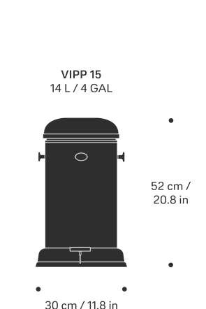 Vipp15-pedalbøtten er en middels stor søppelbøtte til kjøkken, kontor eller bad. Denne pedalbøtten er utstyrt med en utskiftbar innerbøtte, et lokk som sikrer lufttett lukking og en dempermekanisme som gir jevn lukking av lokket. En gummiring på bunnen beskytter gulvet.