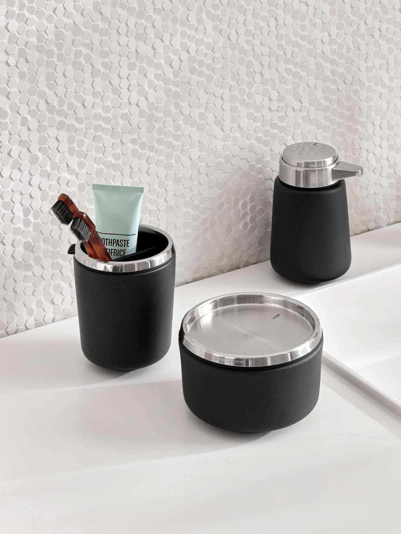Vipp tannbørsteholder er ren baderomsfunksjonalitet. Med en avtakbar indre del av gummi skiller tannbørsteholderen tannbørsten fra tannkremen. En sklisikker gummibunn beskytter overflatene.