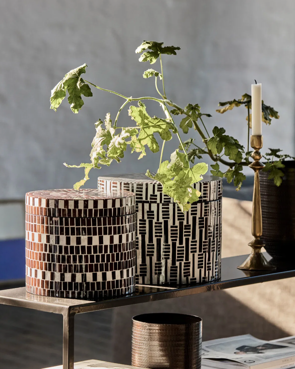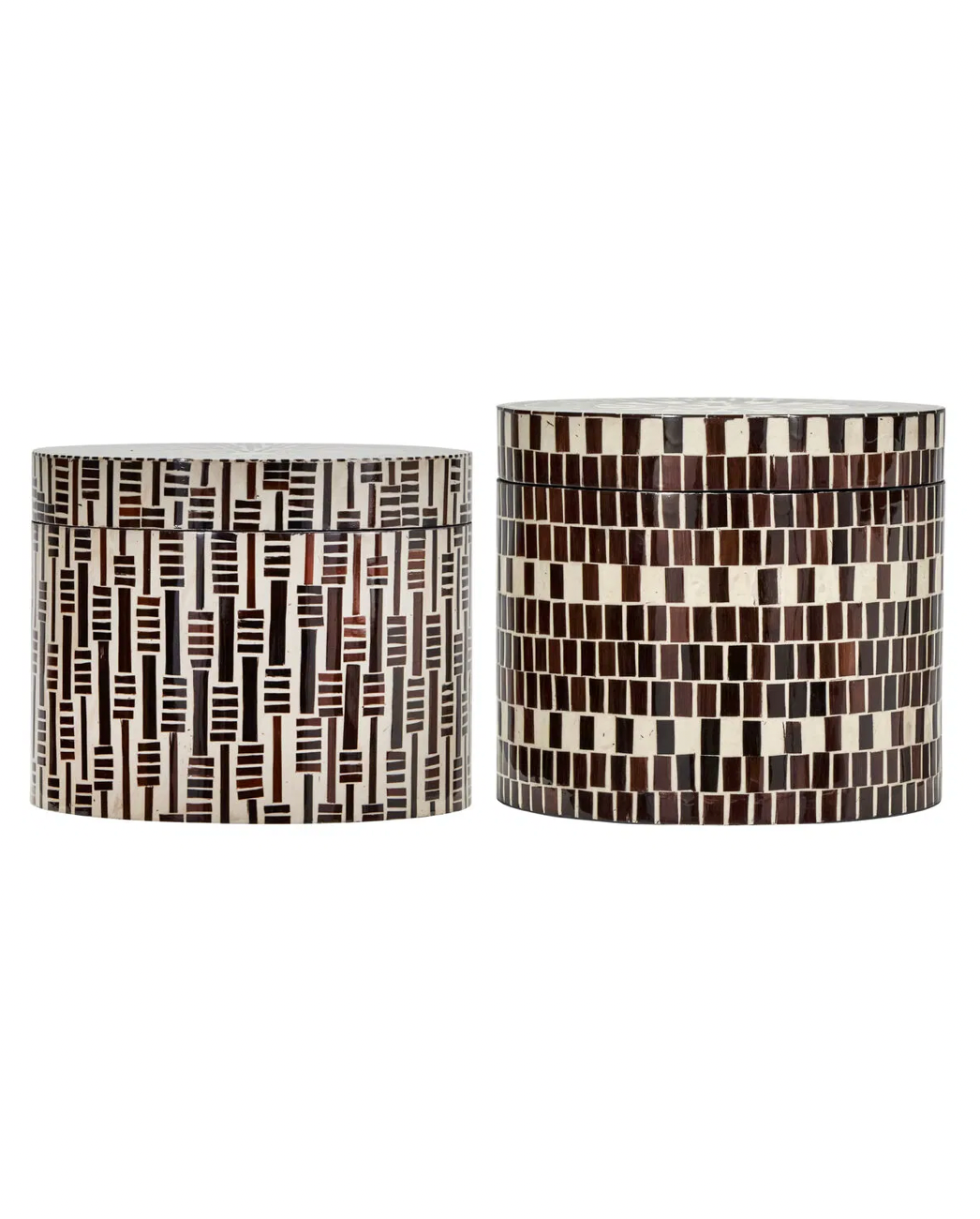 Legg til et unikt preg av stil og personlighet til hjemmet ditt med denne vakre utformede oppbevaringsboksene. Håndlagde bambusmosaikkmønstre i en kombinasjon av delikate mørkebrune toner og kremfarger. Perfekt for å tilføre et dekorativt element til stuen eller soverommet, samtidig som boksen gir praktiske oppbevaringsløsninger.