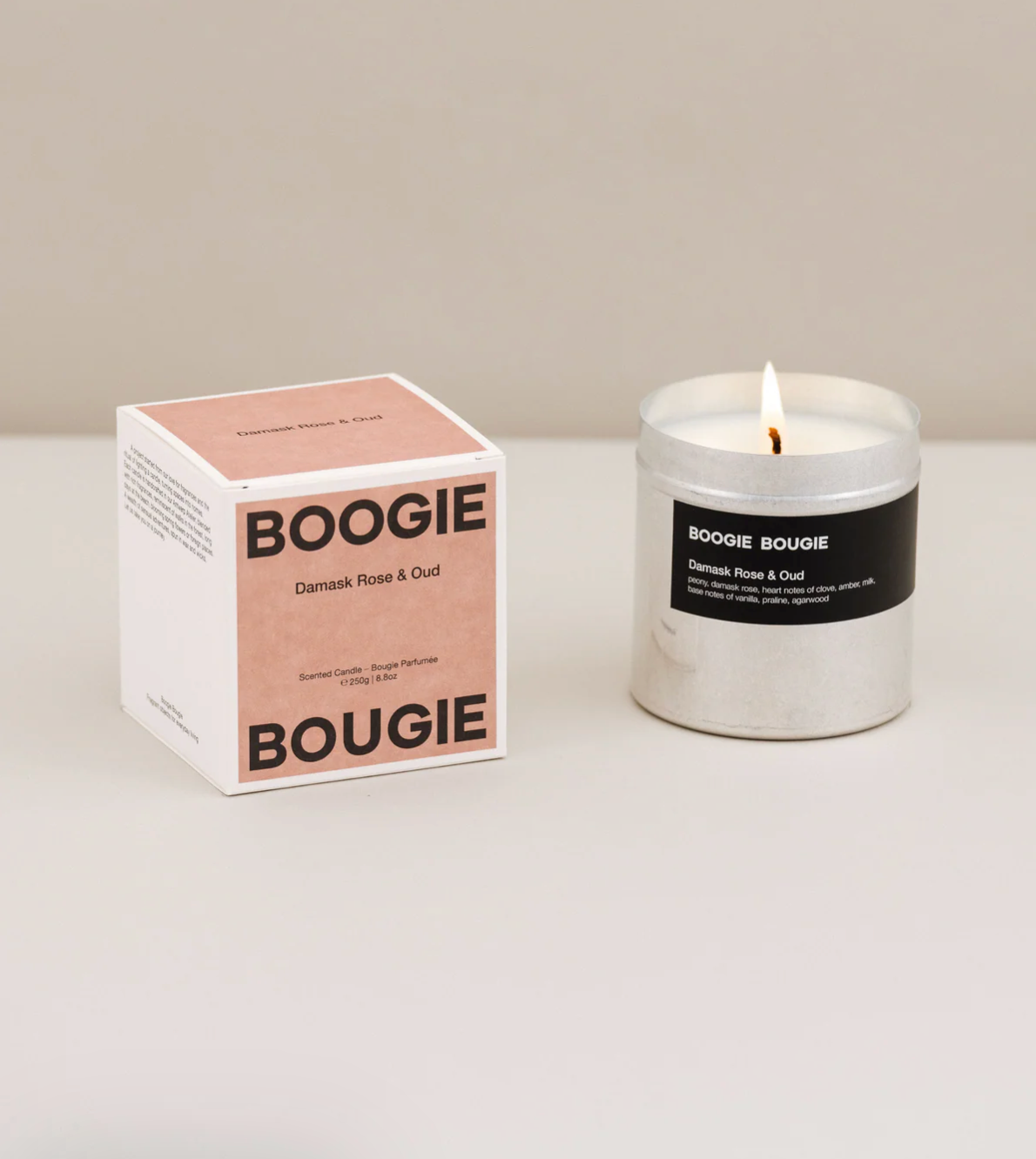 Duftlys med toppnoter av peon og damaskrose, hjertenoter av nellik, rav og melk, og basenoter av vanilje, pralin og oud (agartre).