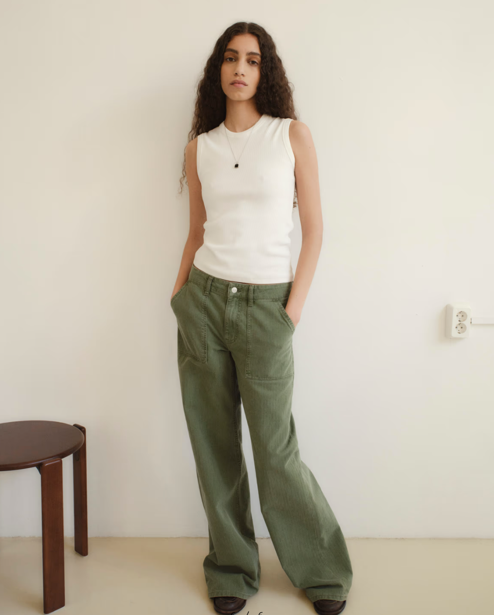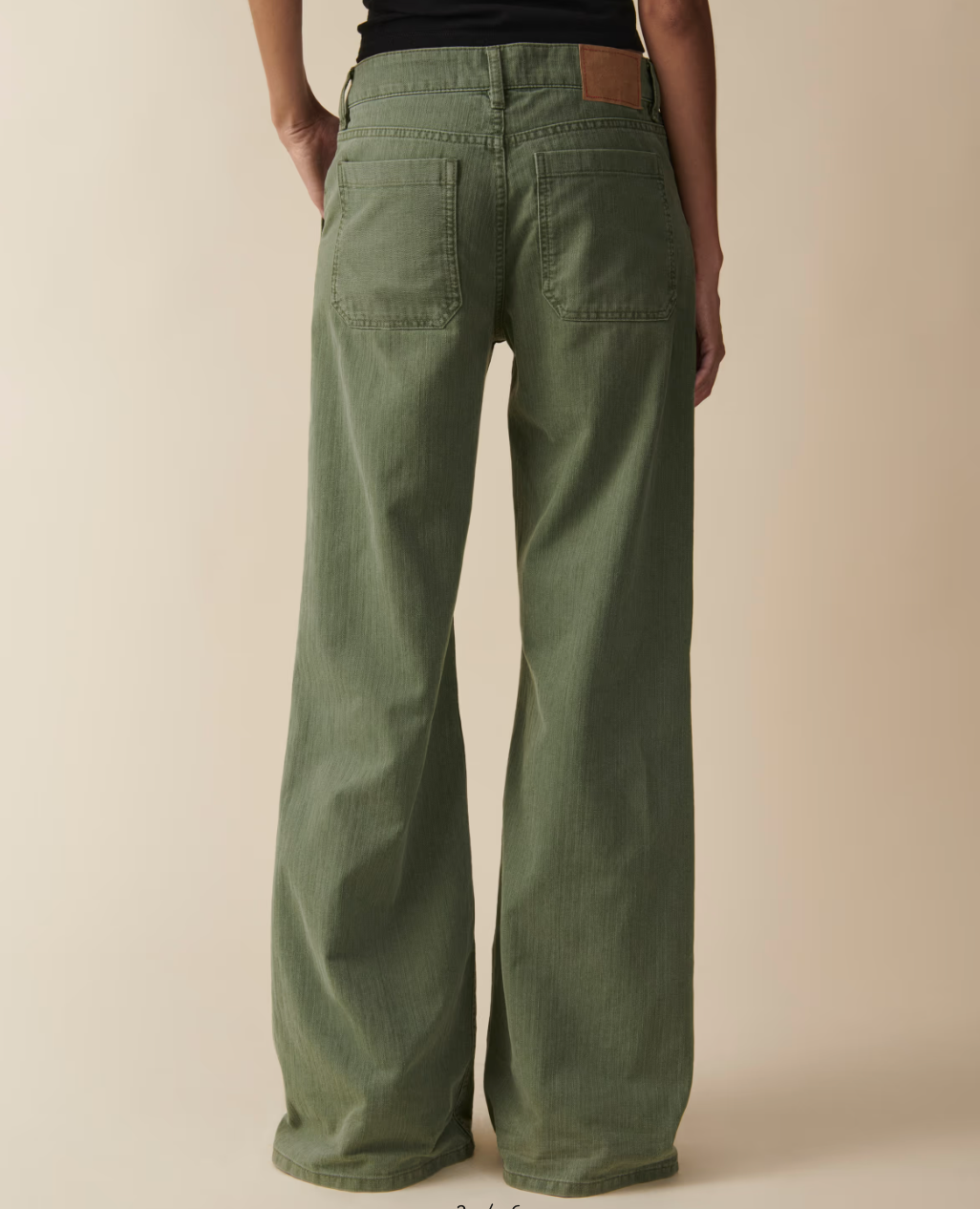 «Guell» er en snekkerinspirert, flare passform med raffinerte arbeidsklærdetaljer. Den har lav midje, ekstra lang, løs bensveis, samt påsydde lommer foran og bak. Denne stilen blander sømløst funksjonalitet med avslappet eleganse, og tilbyr et raffinert og allsidig tillegg til garderoben din.