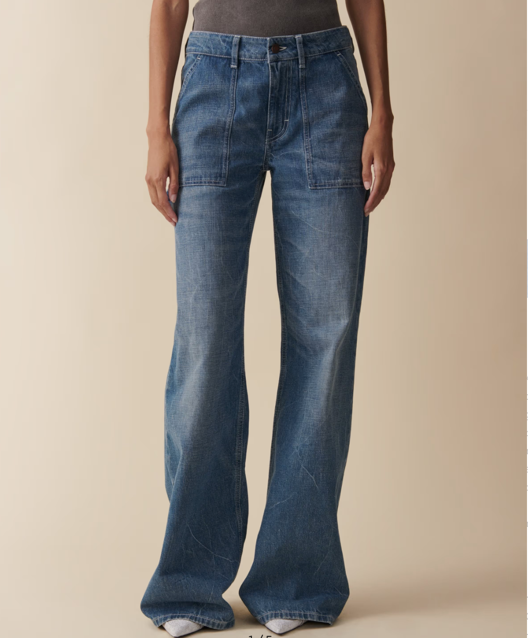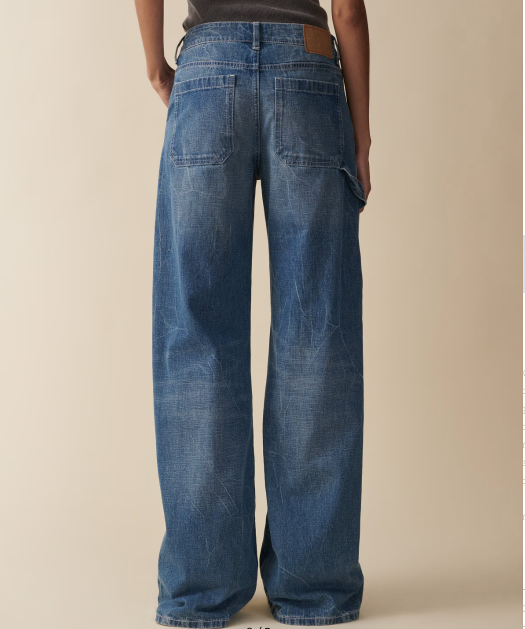 'Guell' is a carpenter-inspired flare fit with refined workwear details. Crafted from rigid denim, it features a low-rise, extra-long loose-leg flare, front and back patch pockets, and a distinctive hammer loop. This style seamlessly blends functionality with relaxed elegance, offering a refined and versatile addition to your wardrobe.Model is 175 cm/5'9” and wears waist 26 and length 34.