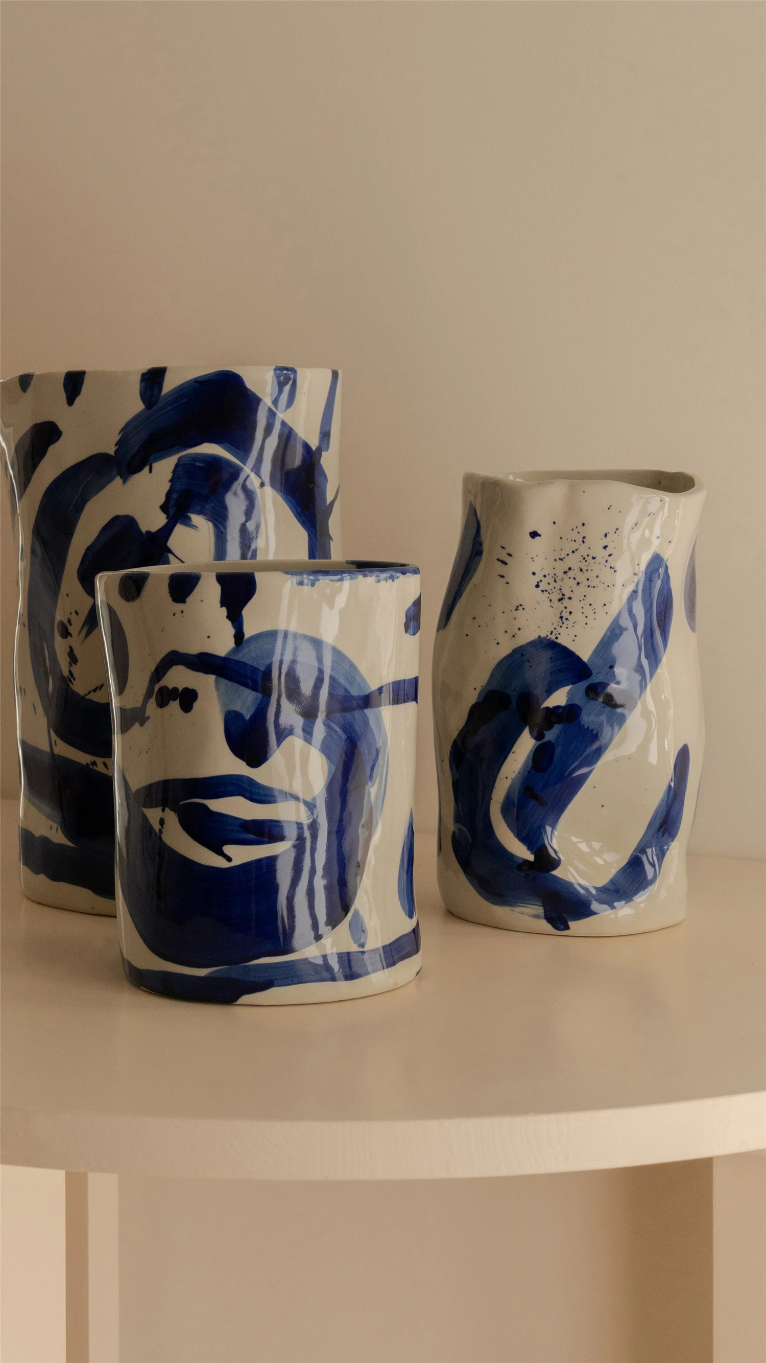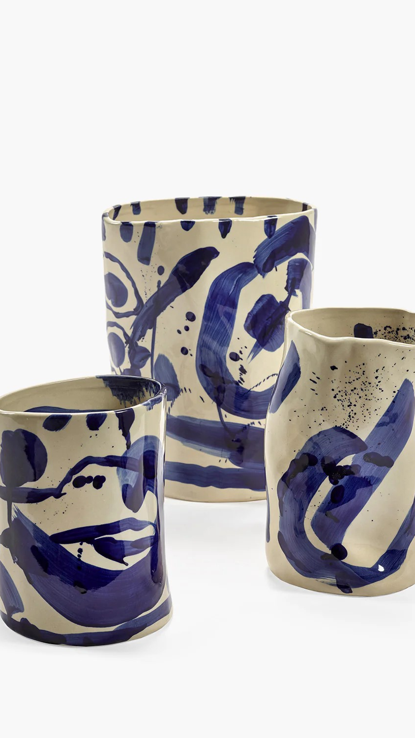 Sophia er en håndlaget keramikkvase designet av Marie Michielssen. Hvert stykke er intuitivt formet og håndmalt, noe som gir det et spontant, kalligrafisk utseende. Asymmetrien og de naturlige ufullkommenhetene gjør disse dekorative vasene helt unike, ideelle som blomstervase eller en kunstnerisk aksent i hjemmet ditt.