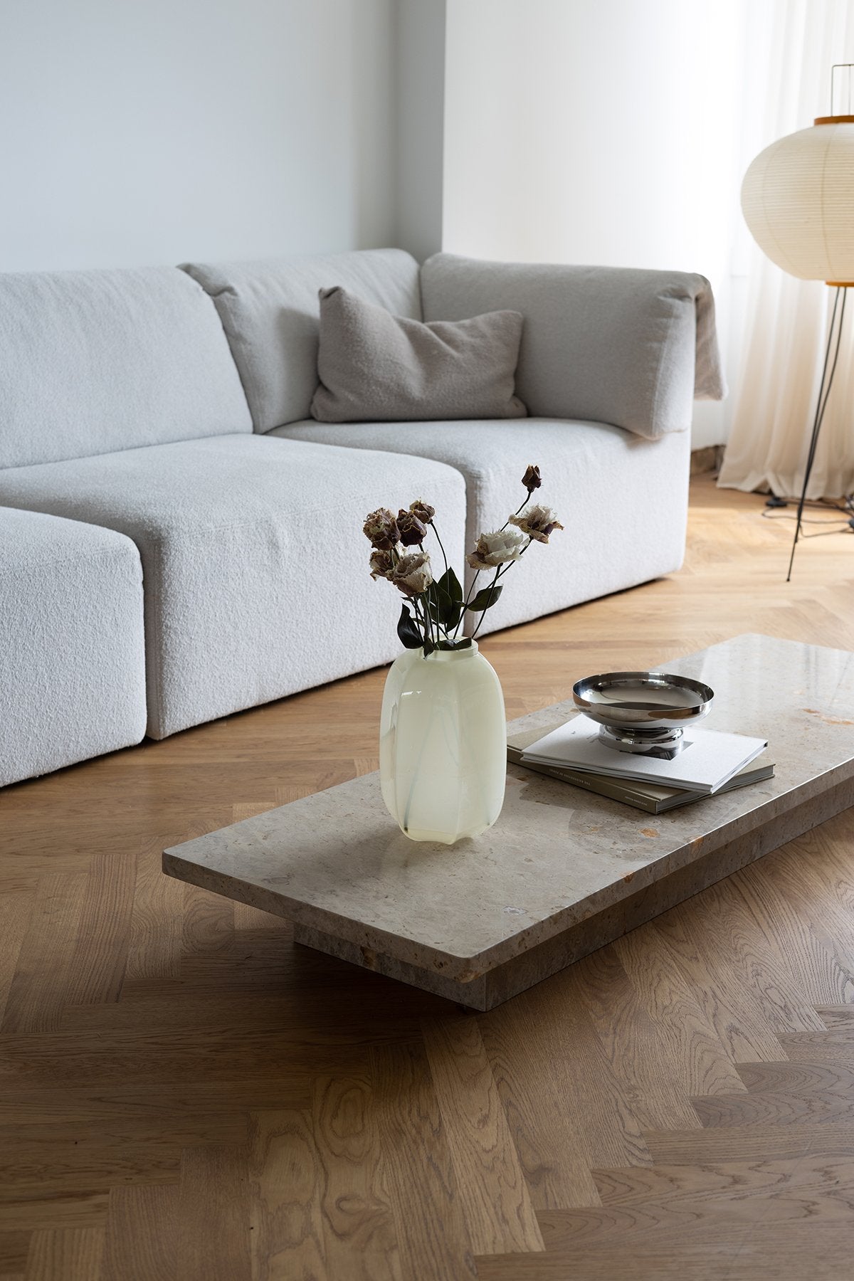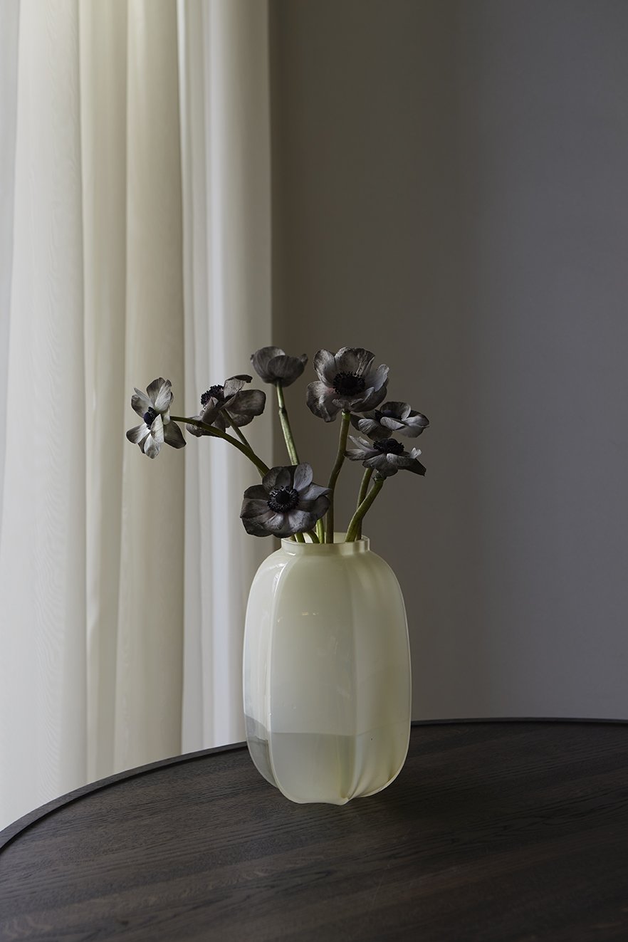 Radvasen er formet for å huse blomstene dine mens den innkapsler skjønnheten og individualiteten til de forskjellige variantene som følger med hver sesong. Den myke formen og ugjennomsiktigheten understreker skjønnheten til de tre utvalgte fargene, Vintage White, Peach og Cloudy Grey