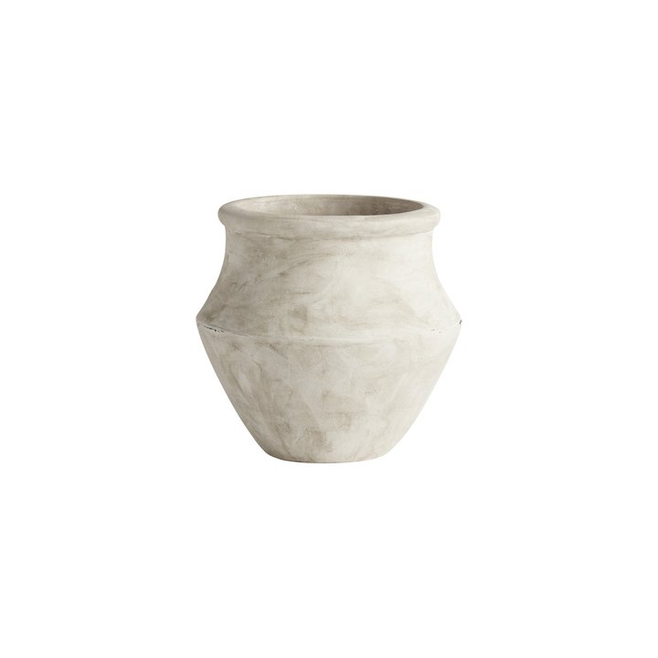 Håndlaget av terrakottaleire i en vasket hvit farge, er denne potten inspirert av middelhavsregionene. Den detaljerte overflaten passer perfekt til den lyse sommeren og de mørkere høstnyansene. Formen på krukken er dekorativ og enkel, og potten er perfekt for små planter, dekorative grener og blomster.