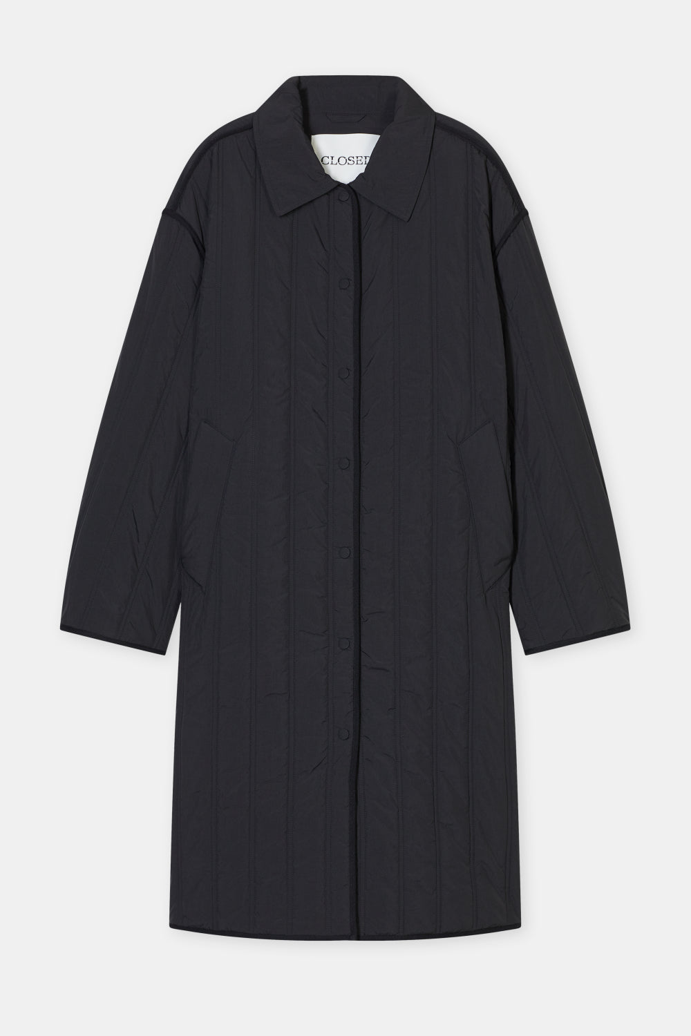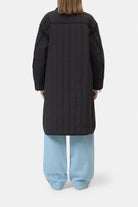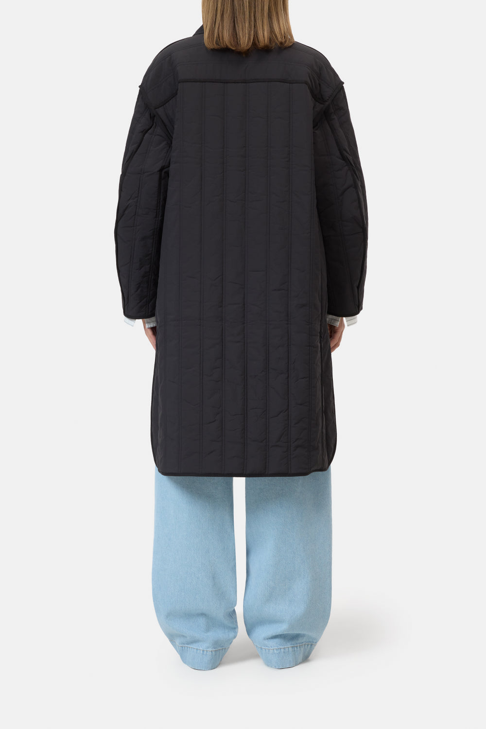 Den quiltede kåpen har en avslappet passform og generøs lengde. Laget av vannavvisende nylon med krølletekstur og matt overflate, har vertikal quilting, gummierte logotrykk, skjulte trykknapplommer, sideventiler og Thermore Ecodown-isolasjon.