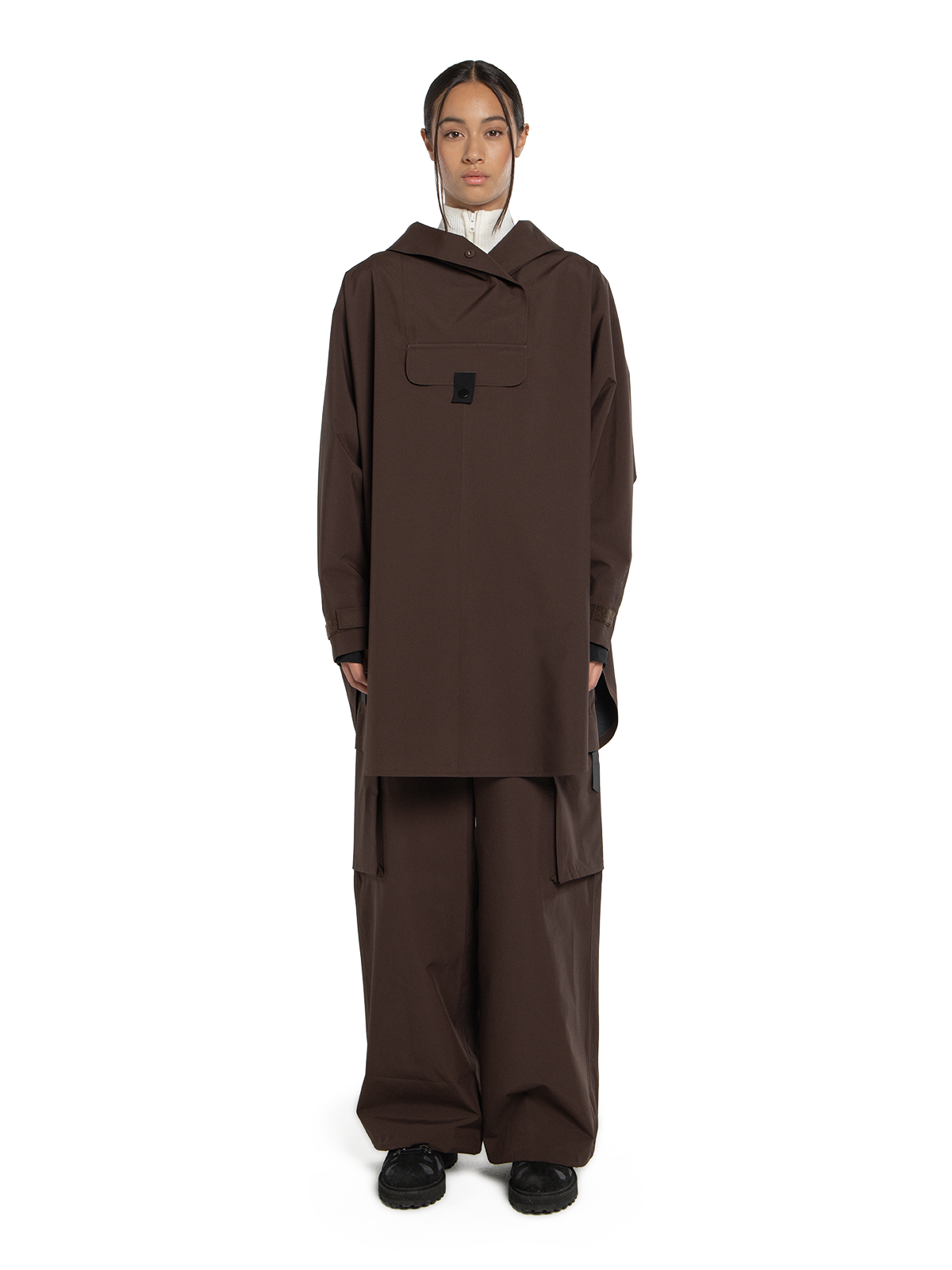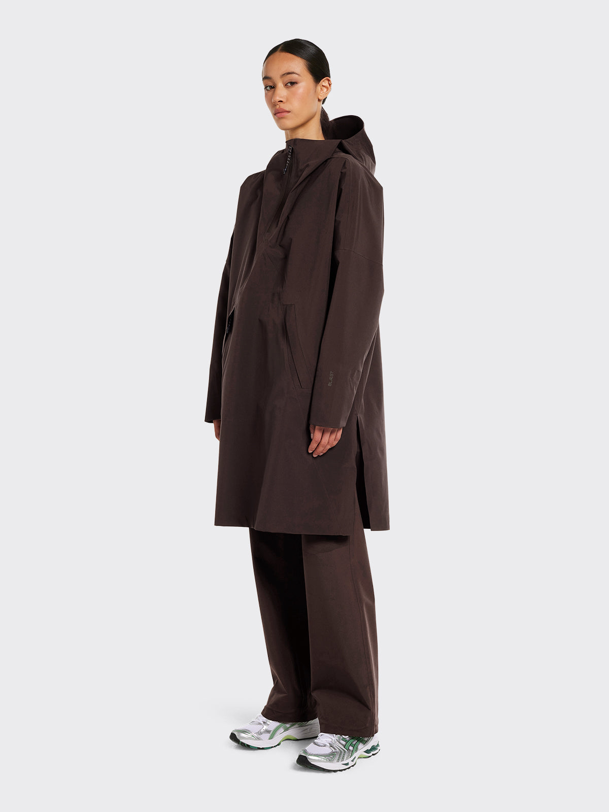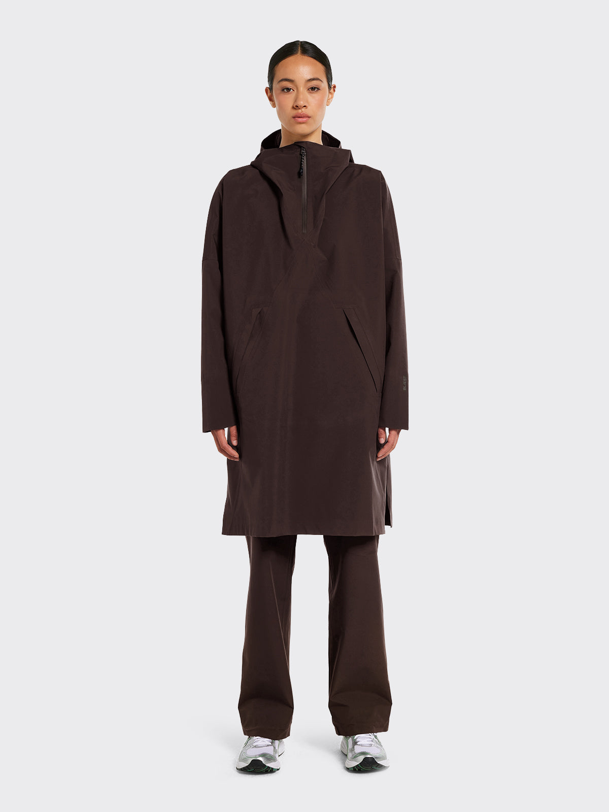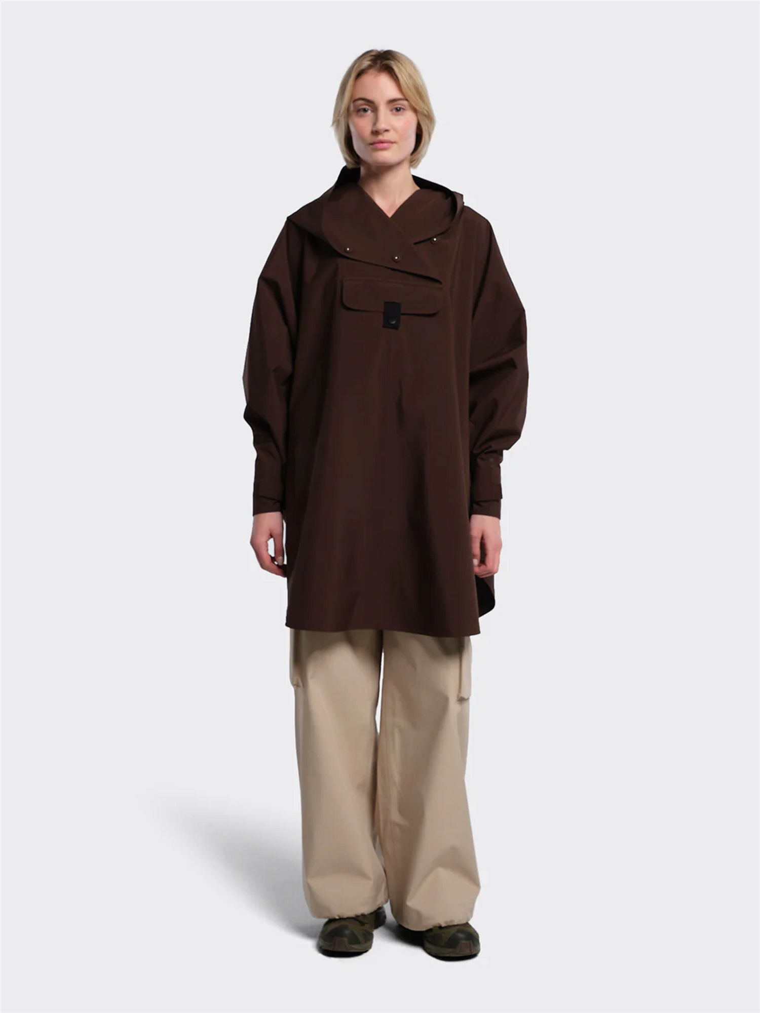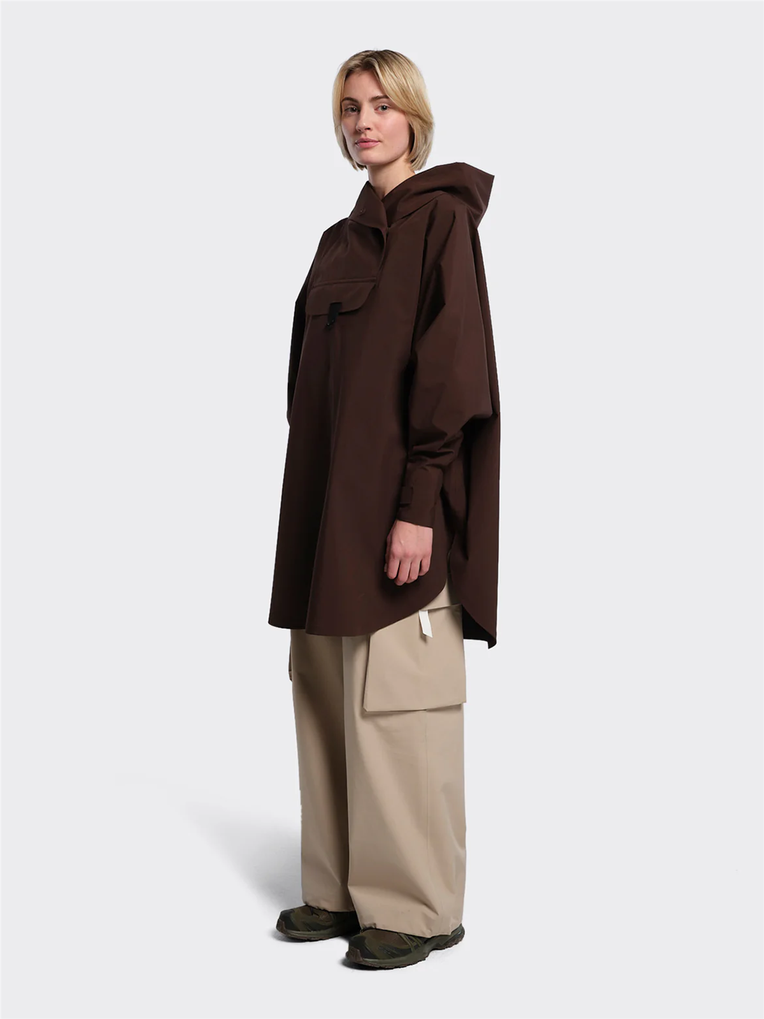 Bergen Poncho har A-formet silhuett. Den er vanntett, vindtett og pustende og passer i alle typer vær - hele året! Oversized passform. – Justerbar ermeåpning med elastisk lycra-mansjett