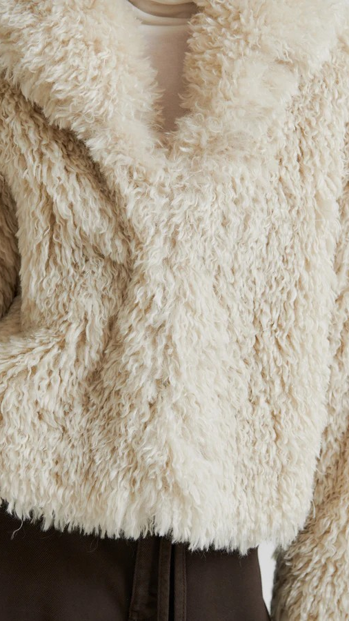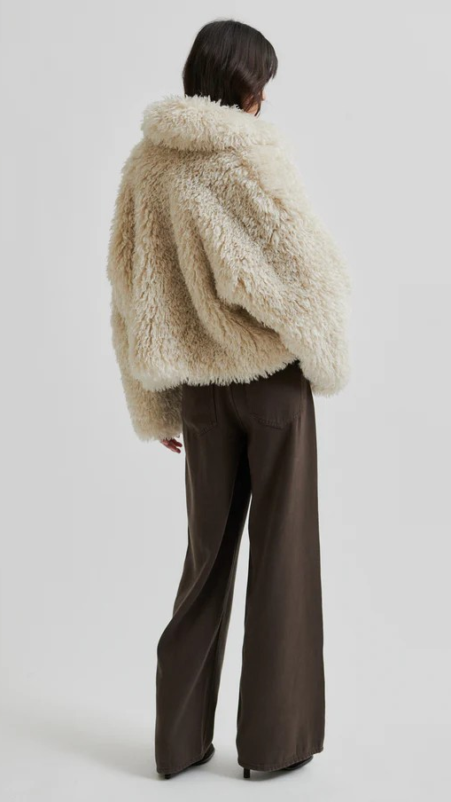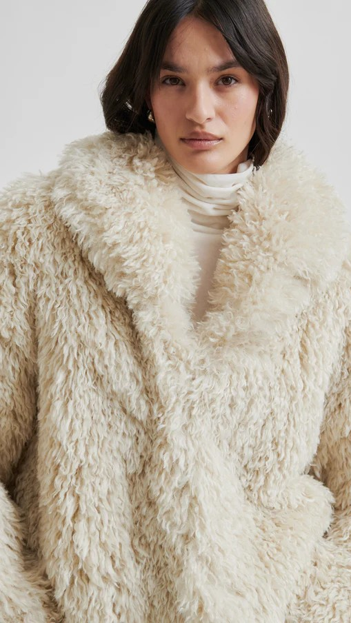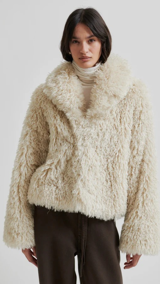 Superfin jakke fra Second Female. Jakken er laget i et ultramykt stoff med raggete, saueaktig tekstur. Med skjult hektelås foran og to skjulte lommer. Fullt fôret. Normal passform med avslappet, litt boksete silhuett.