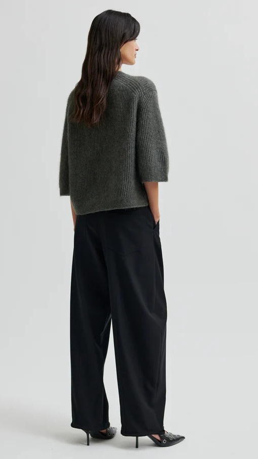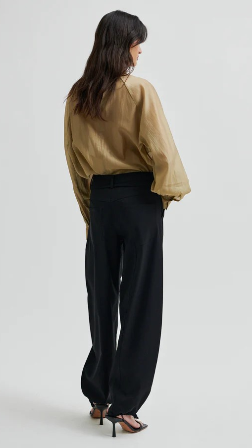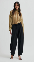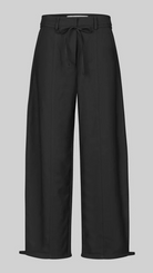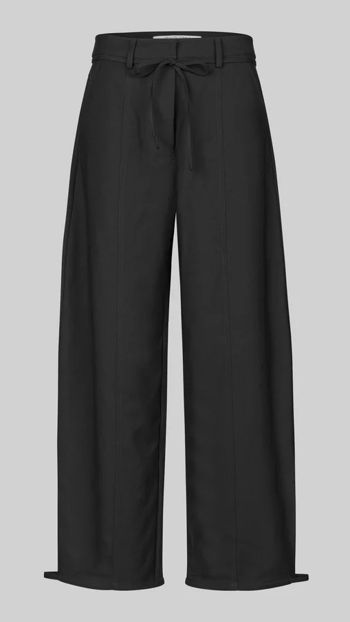Cargo-bukse med knytebelte. Buksen er laget i en drapert viskoseblanding. Med skjult glidelås, krok og knappelukking. To lommer foran og bak. Knytebelte i midjen og snøring med knyting ved ankelen. Middels midje med baggy ben.