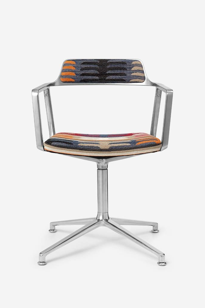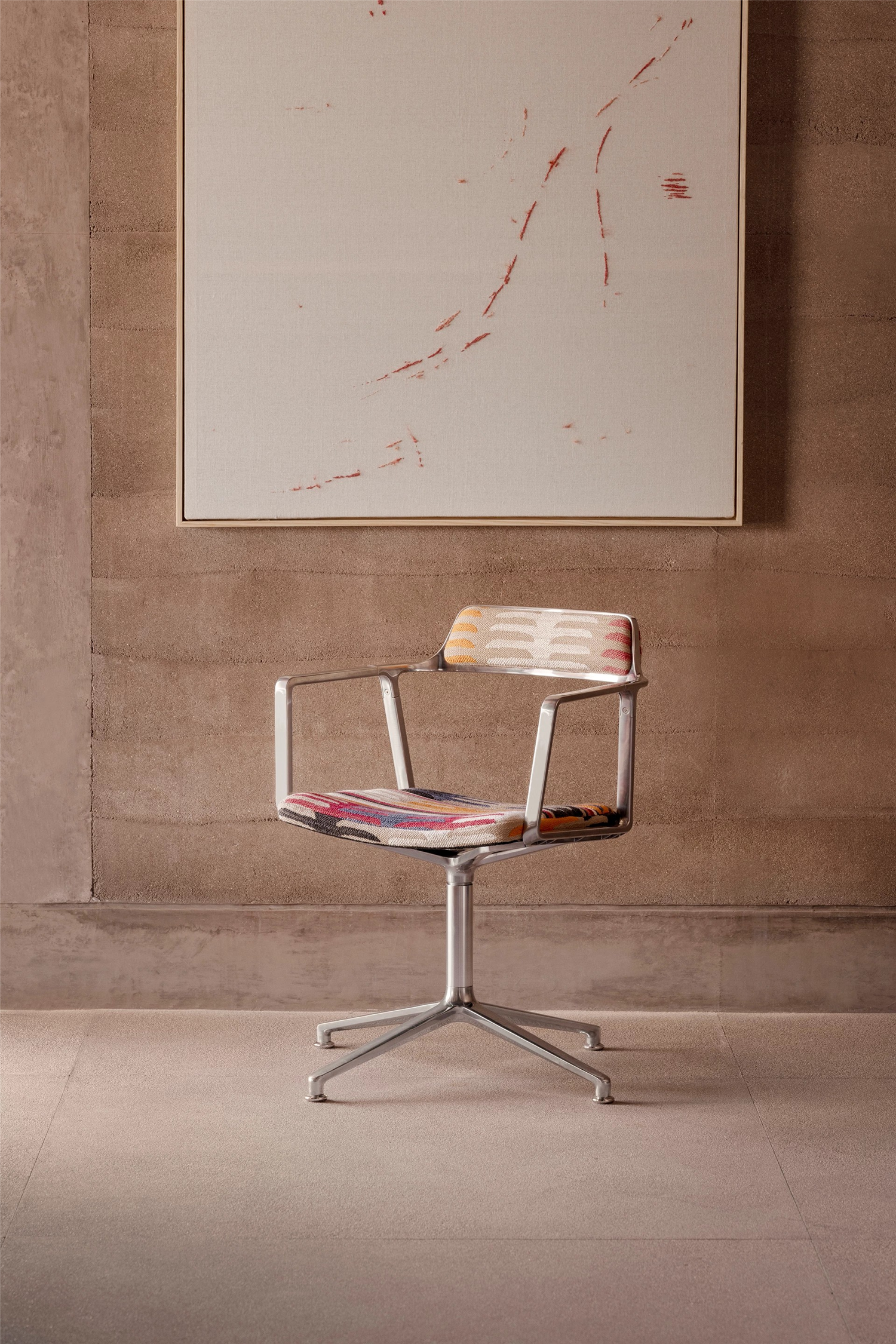 Denne spesialutgaven av Vipp Swivel-stolen er laget for gjestehuset Vipp Todos Santos i Mexico, og har et levende jacquardstoff fra det anerkjente franske tekstilhuset Pierre Frey. De grafiske bayadère-stripene er valgt for sine dristige farger og rike teksturer som gjenspeiler den livlige ånden i Mexico, og gir en strålende kontrast til stolens industrielle aluminiumsramme.