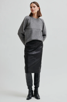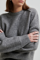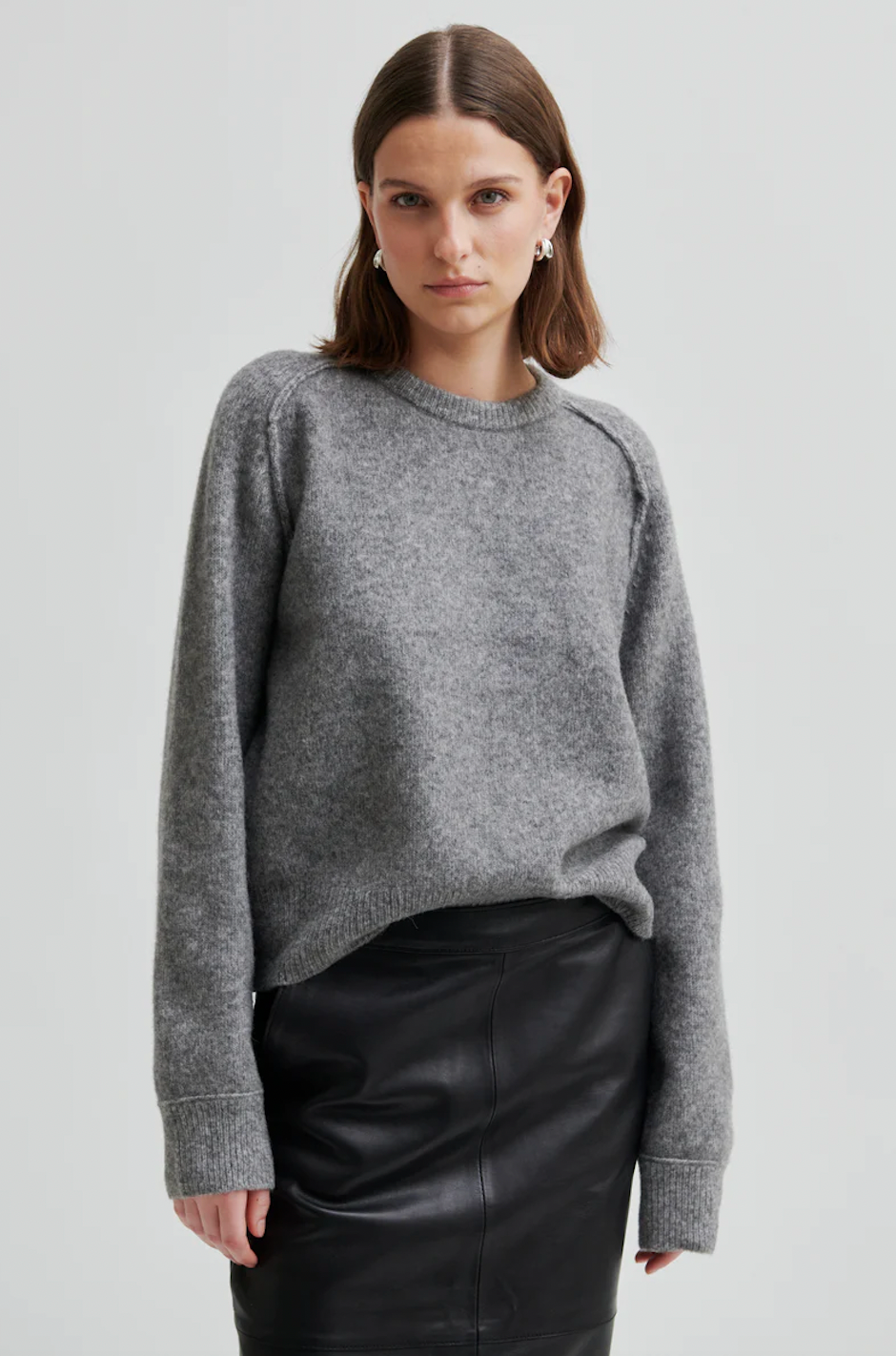 Second Female round-neck pullover. The pullover is made in a soft wool blend. Featuring a round neck and raglan sleeves with reverse shoulder seam details. Ribbed neck, cuffs and bottom hem. Regular, slightly wider fit.
