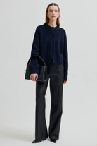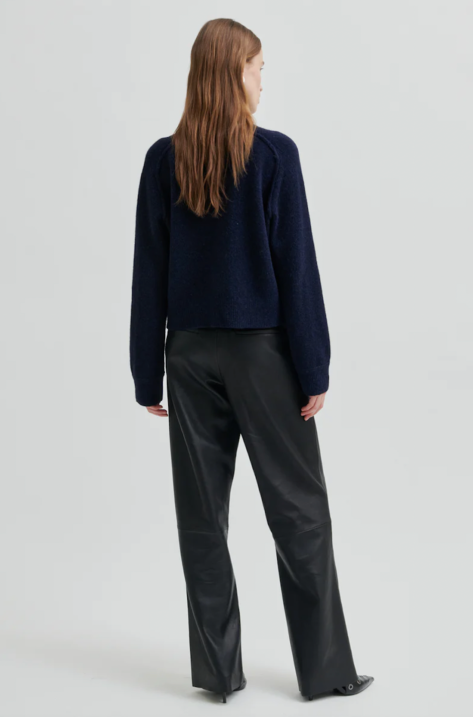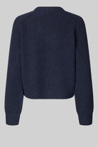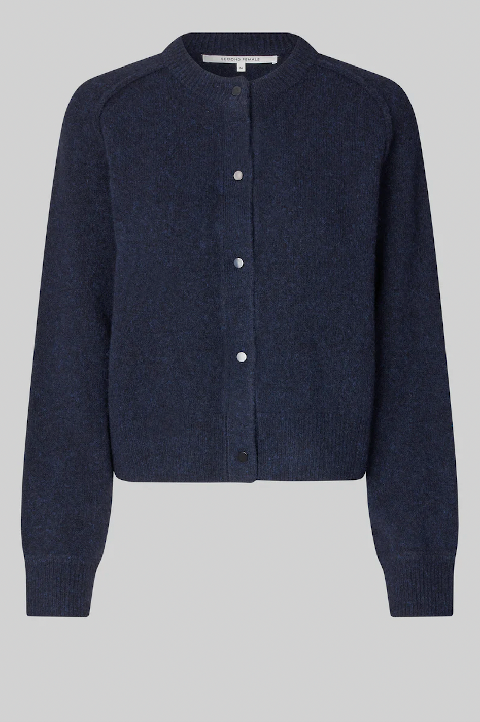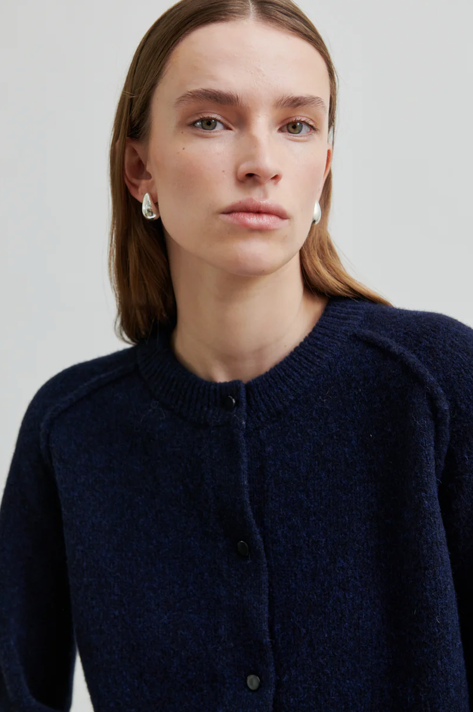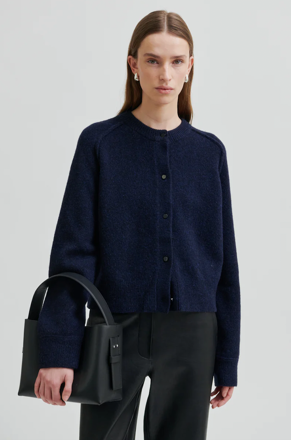 Second Female round-neck cardigan. The cardigan is made in a soft wool blend. Featuring a round neck and button-through fastening. Raglan sleeves with reverse shoulder seam details. Ribbed neck, placket, cuffs and bottom hem. Relaxed fit.