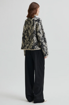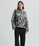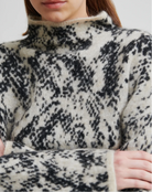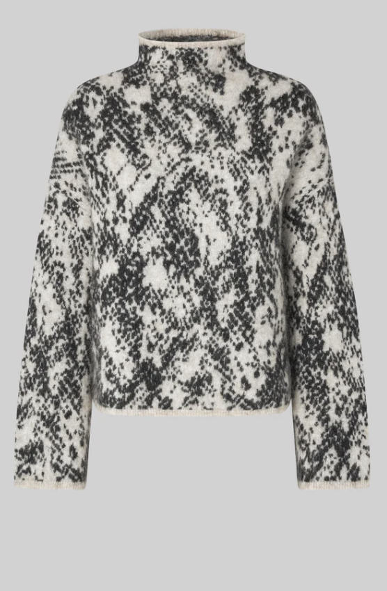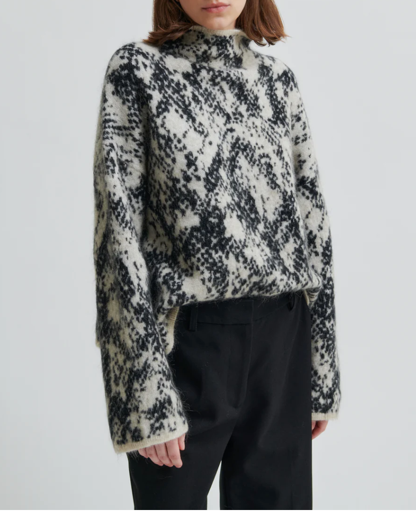 Second Female mønstret genser med polohals. Genseren er laget i en myk mohair- og ullblanding med heldekkende mønster. Har polohals og senkede skuldre med lange ermer. Kontrastkant i halsen, mansjettene og nederst. Avslappet, vid passform.