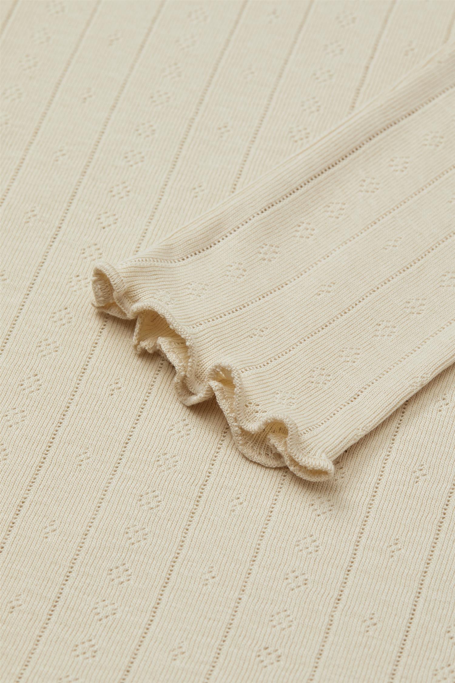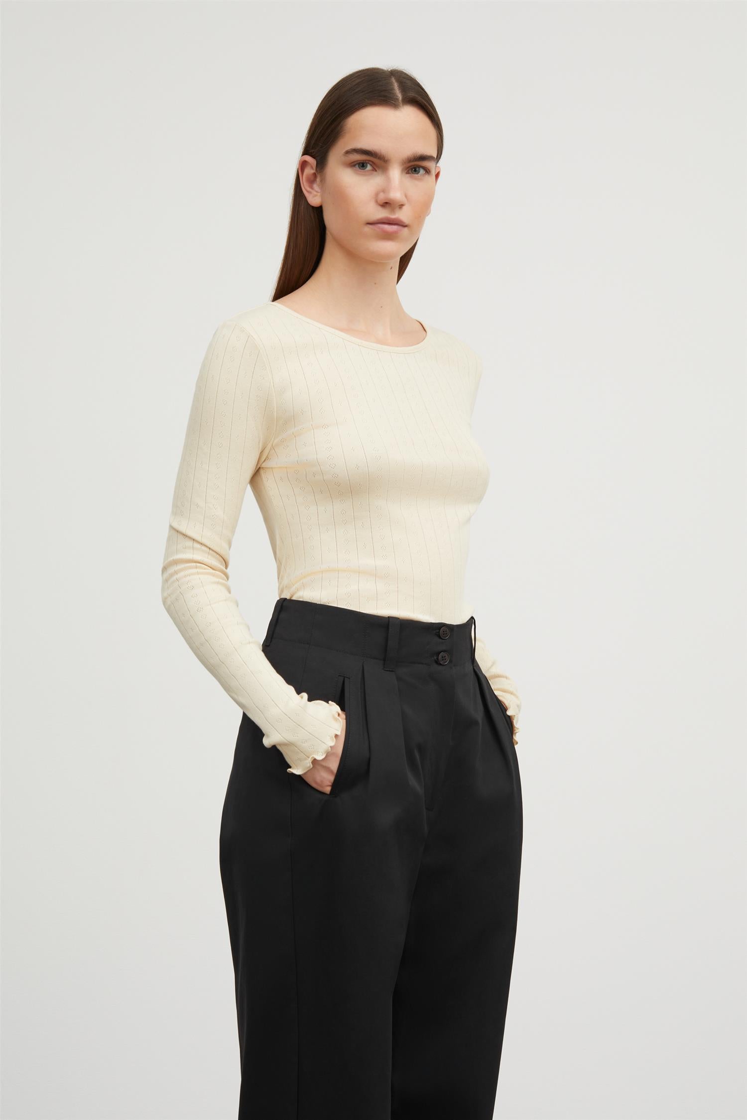 Myk bomullsbluse med fin pointelle-tekstur og babylock-kanter.Normal i størrelsen med en slank silhuett for en tettsittende passform.